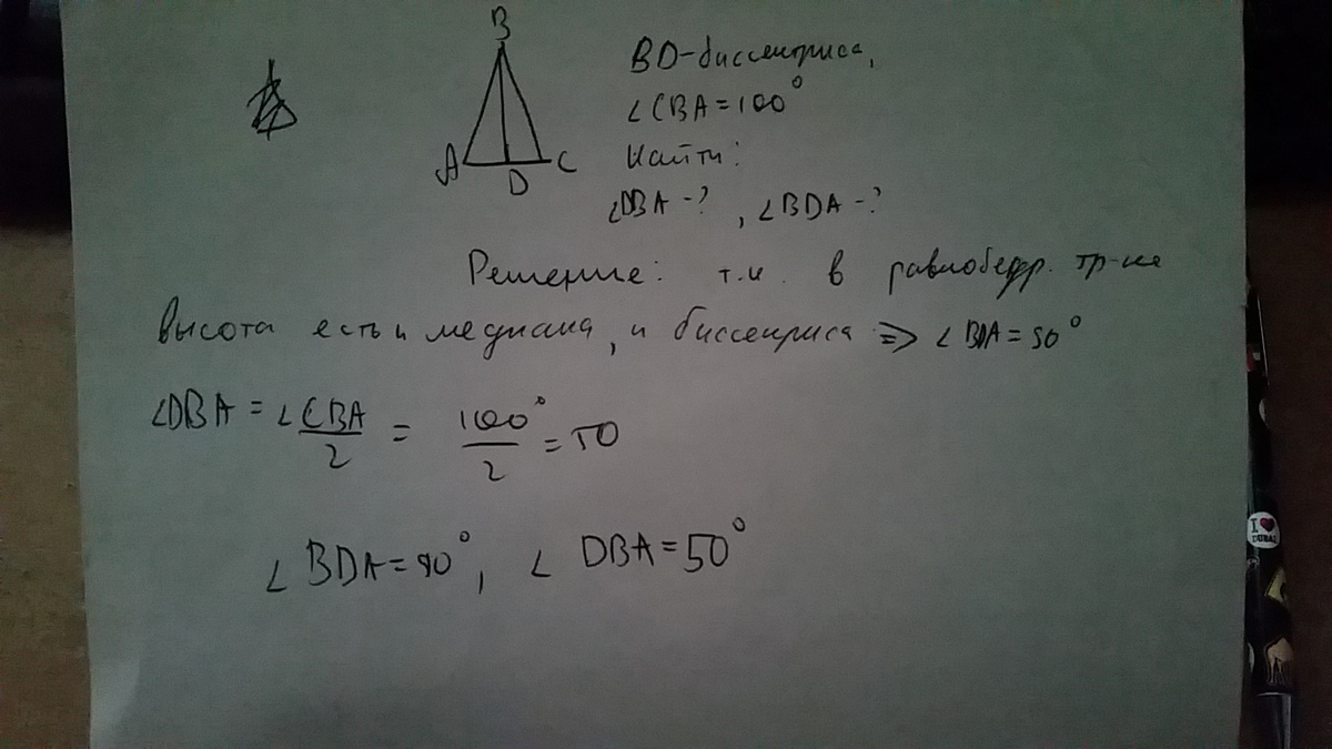 В равнобедренном треугольнике abc с основанием ac проведена биссектриса BD. Найдите углы DBA и BDA, если угол CBA равен 100 градусов. Срочно,пожалуйста,помогите! !