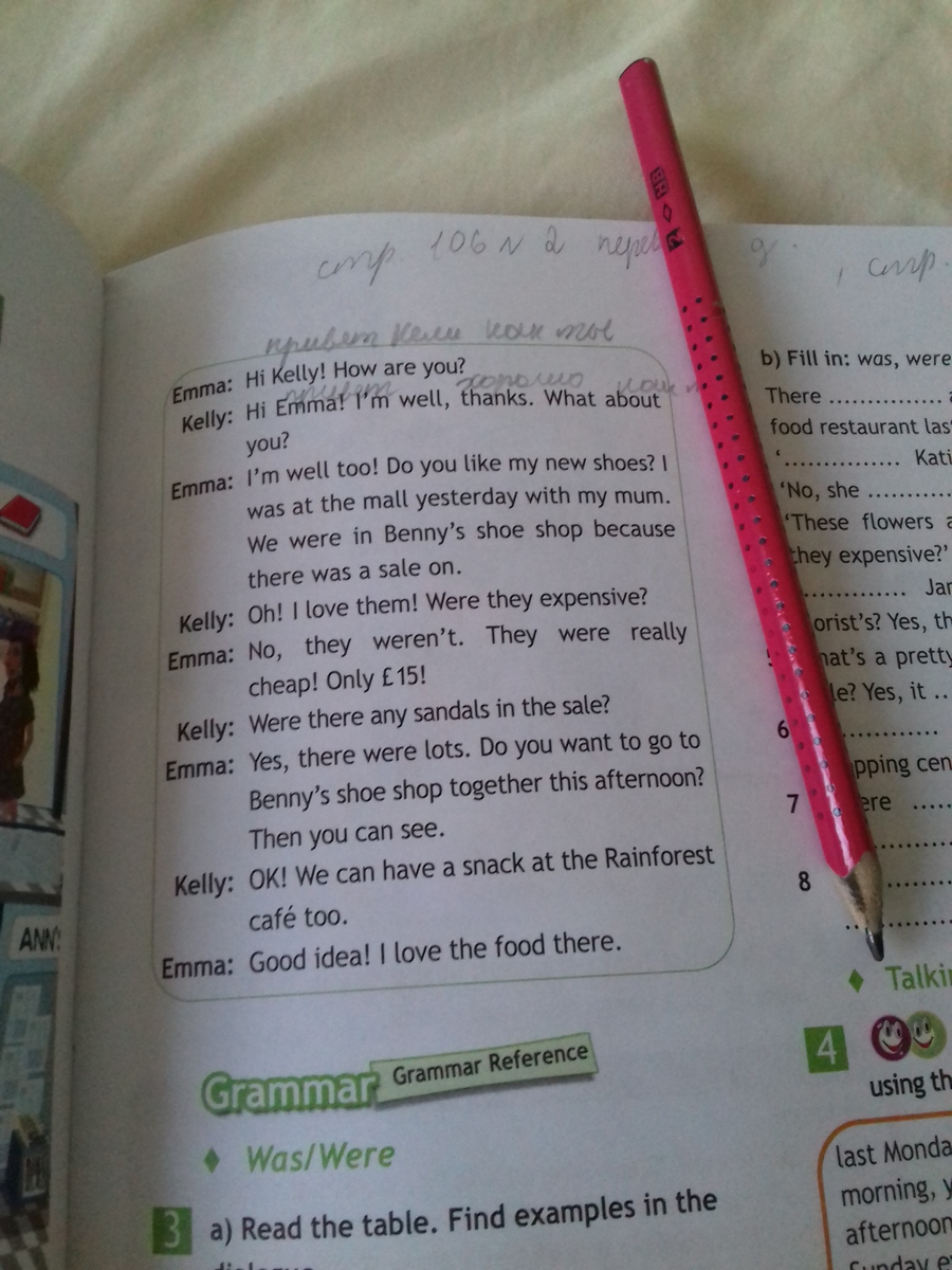 Эмма: Я тоже хорошо. Вам нравятся мои новые ботинки? Я вчера была в торговом центре с мамой. Мы были в обувном магазине Бенни, они были выставлены на продажу.