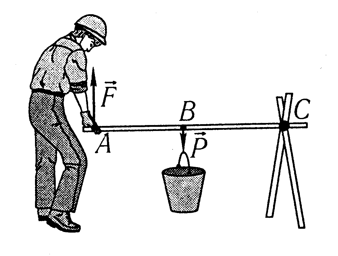 На рисунке человек с помощью палки удерживает ведро с водой. Какой буквой обозначена точка опоры?