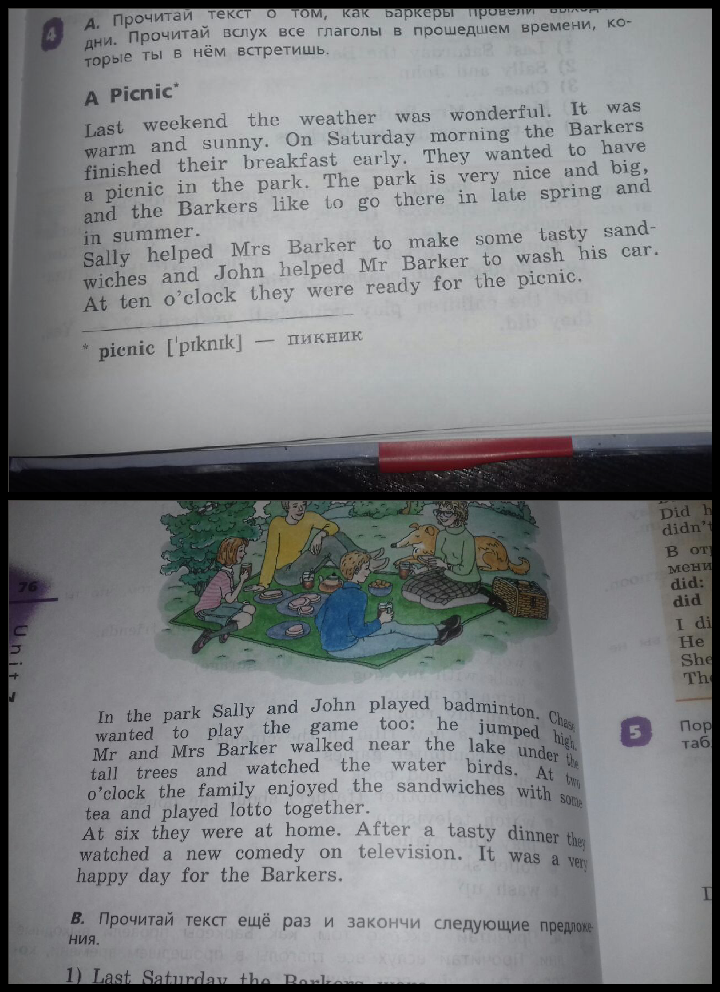 На прошлых выходных погода была прекрасное. Было тепло и солнечно.В субботу утром Баркеры закончили обедать раньше обычного. Они хотели устроить пикник в парке. Парк очень хороший и большой и Баркеры любят ходить туда в конце весны и летом.Салли помогла сделать миссис Баркер вкусные сэндвичи и Джон помог мистеру Баркеру помыть его машину. В 10 часов они были готовы к пикнику. В парке Салли и Джон играли в бадминтон. Чейз хотел играть тоже: он прыгал высоко.Мистер и миссим Баркер гуляли возле озера под высокими деревьями и смотрели на водоплавающих птиц.В 2 часа семья наслаждалась сэндвичами с чаем и играла в лото. В 6 они были дома. После вкусного ужина они смотрели новую комедию по телефизору. Это был очень хороший день для Баркеров.