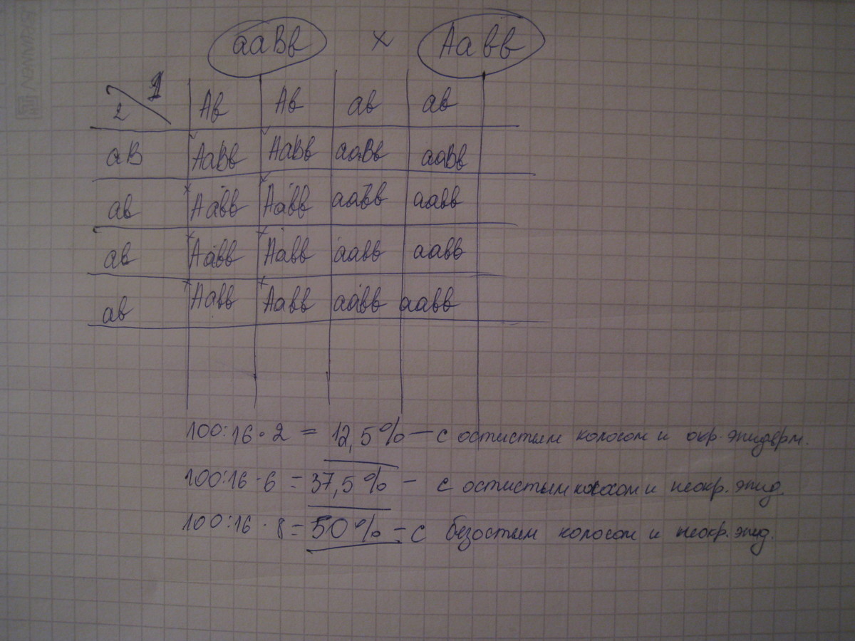 у пшеницы признак остистости колоса(А) доминирует над безостостью(а) , а окрашенный эндосперм(В) доминирует над неокрашенным(в) . Какое потомство можно ожидать от скрещивания растений злаков с безостым колосом и окрашенным эндоспермом, гетерозиготных по второму признаку, с растениями, имеющими остистые колосья и неокрашенный эндосперм, гетерозиготными по первому признаку.