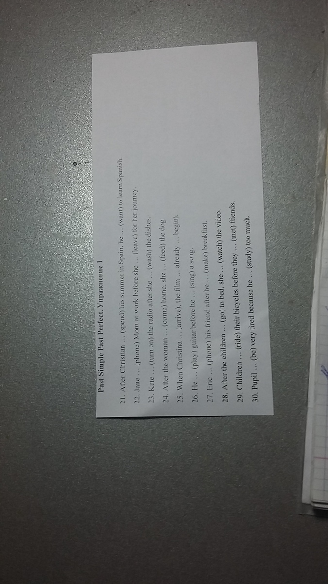 1) spent/wanted 2)had phoned/ left 3)turned on/ washed 4) had come/fed 5)arrived/had begun 6) had okayed/sang 7)phoned/had made 8)had gone/ watched 9) had ridden/ met 10) were/ had studied