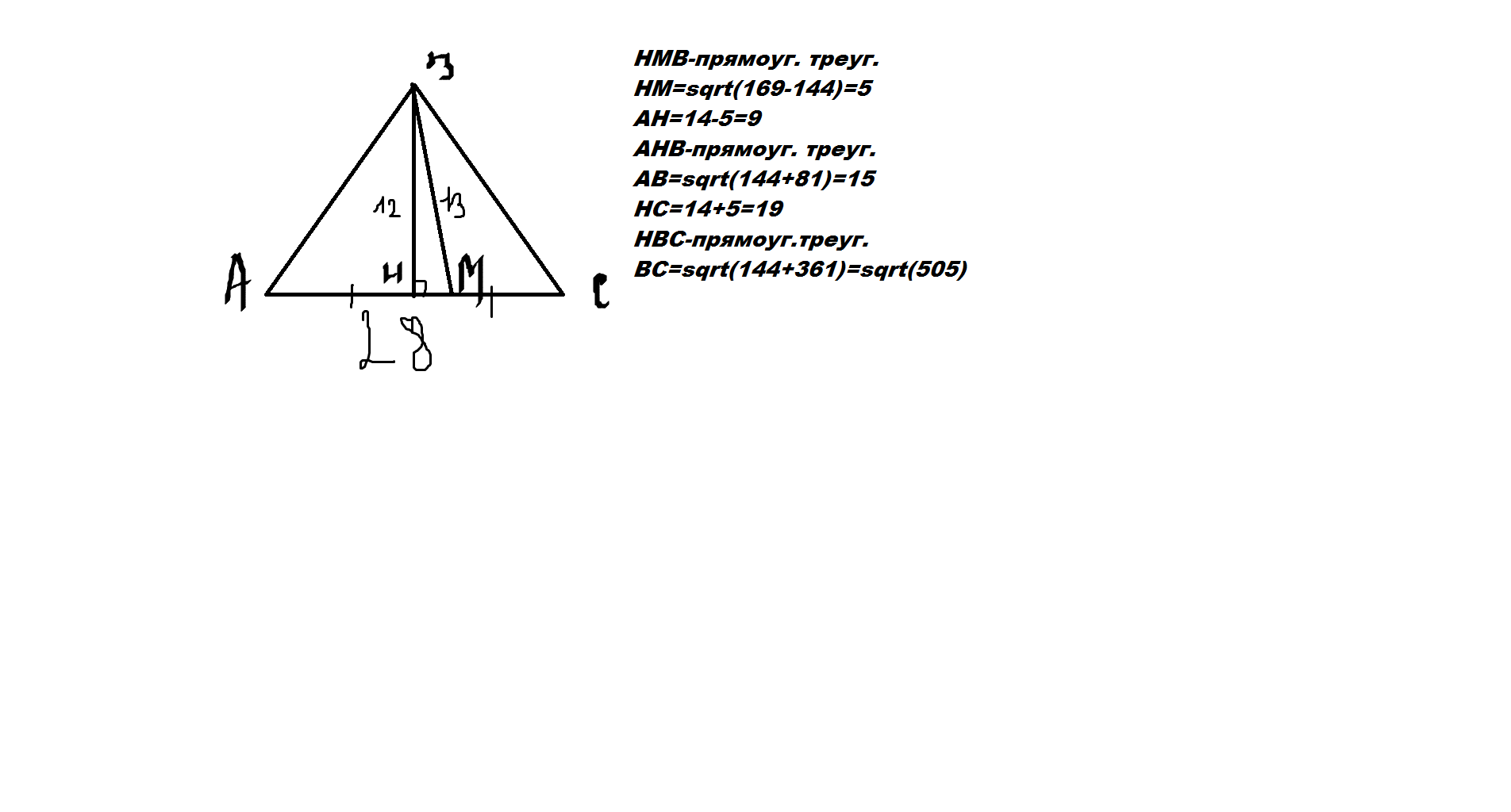 в треугольнике высота и медиана, проведенные к стороне 28 см, равны 12 и 13 см. Найдите длину меньшей из оставшихся сторон.