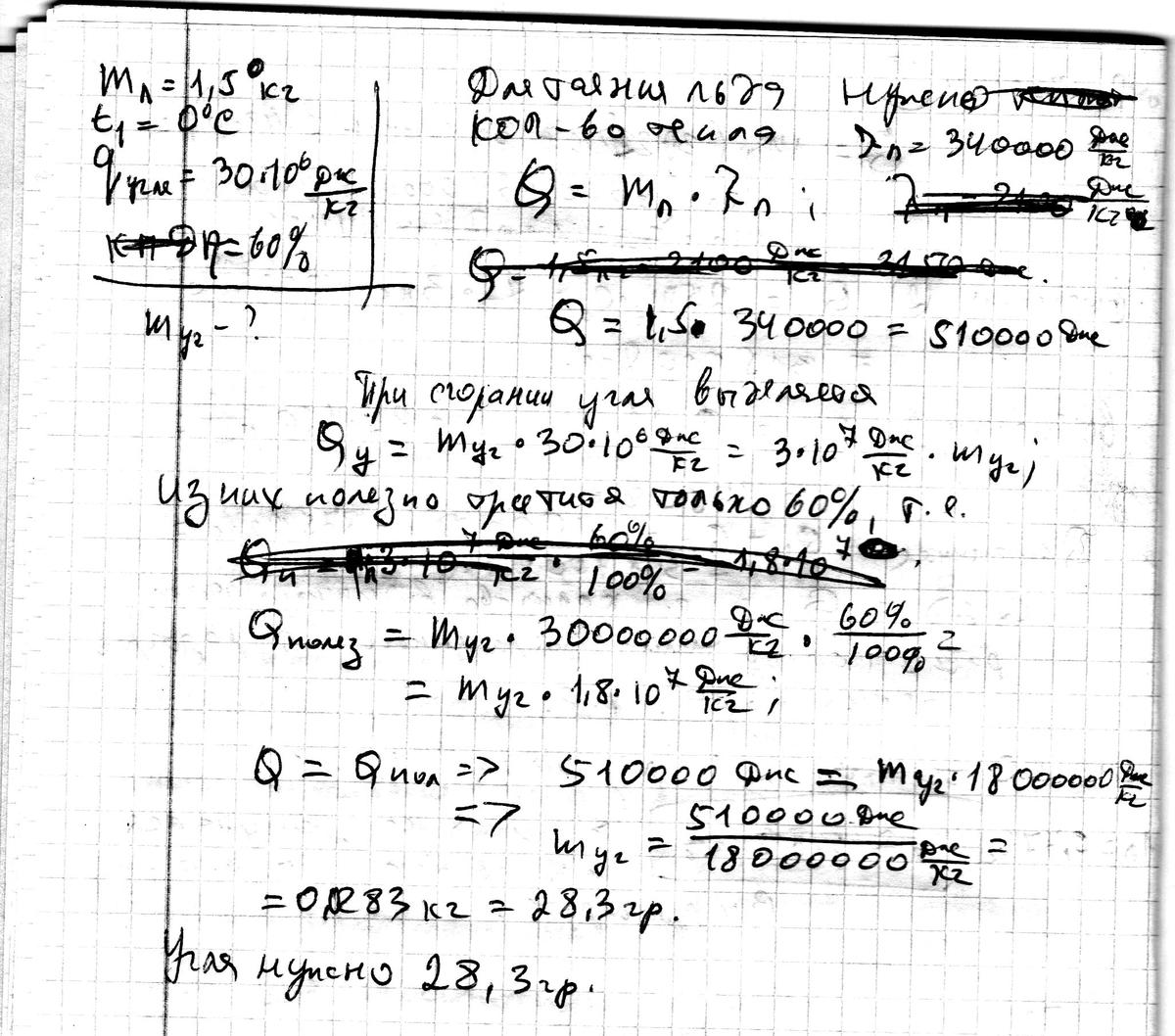 Сколько надо сжечь каменного угля в печи, чтобы превратить в пар 1,5 кг льда, взятого при температуре 0 градусов? Удельная теплота сгорания каменного угля. составляет 30 Мдж/кг, КПД печи - 60%.