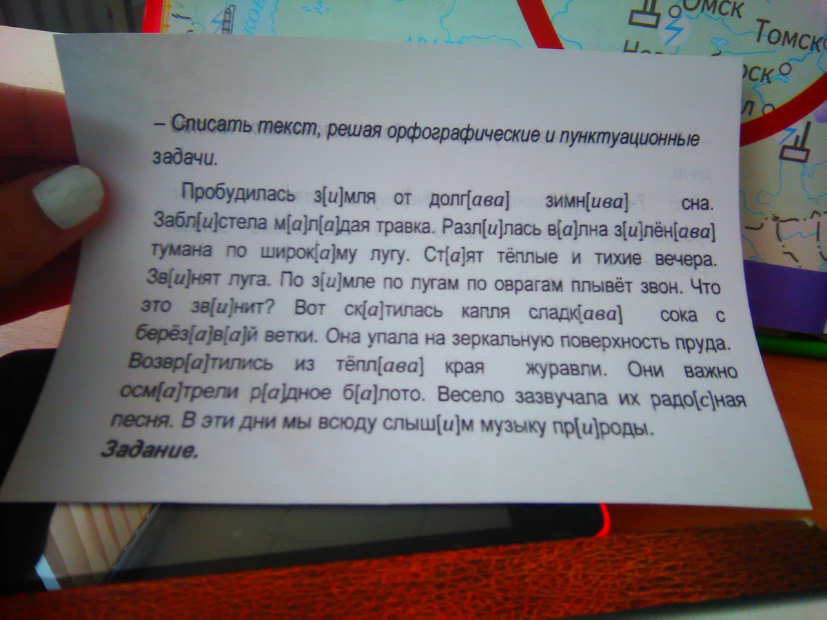 Пробудилась земля от долгого зимнего сна. Заблестела молодая травка. Разлилась волна зелёного тумана по широкому лугу. Стоят тёплые и тихие вечера. Звенят луга. По земле, по лугам, по оврагам плывёт звон. Что это звенит? Вот скатилась капля сладкого сока с берёзовой ветки. Она упала на зеркальную поверхность пруда. Возвратились из тёплого края журавли. Они важно осмотрели родное болото. Весело зазвучала их радостная песня. В эти дни мы всюду слышим музыку природы.