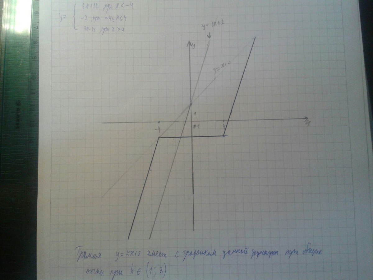 Ребят помогите пожалуйста! Постройте график кусочно заданной функции: y=система: 3x+10 при x<-4, -2 при -4<=x<=4, 3x-14 при x>4. Найдите все значения k, при которых прямая y=kx+2 пересекает этот график в трёх различных точках. Вот фото