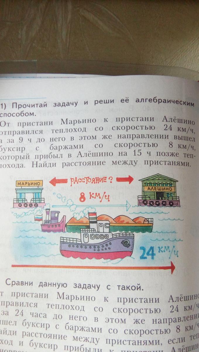 Допустим, что теплоход ехал х часов. Тогда он проехал путь равный 24 * х = 24х, а буксир проехал путь равный 8 * (9 + х + 15) = 8 * (24 + х) = 192 + 8х. А так как и теплоход, и буксир проехали равные пути, то можно сказать, что 24х = 192 + 8х. Решим это уравнение: 24х = 192 + 8х => 24x - 8x = 192 => 16x = 192 => x = 12. Значит время, которое ехал теплоход составляет 12 часов, а ехал он со скоростью 24 км/ч, значит можем найти путь: 12 * 24 = 288 км - расстояние между пристанями (ответ на задачу).