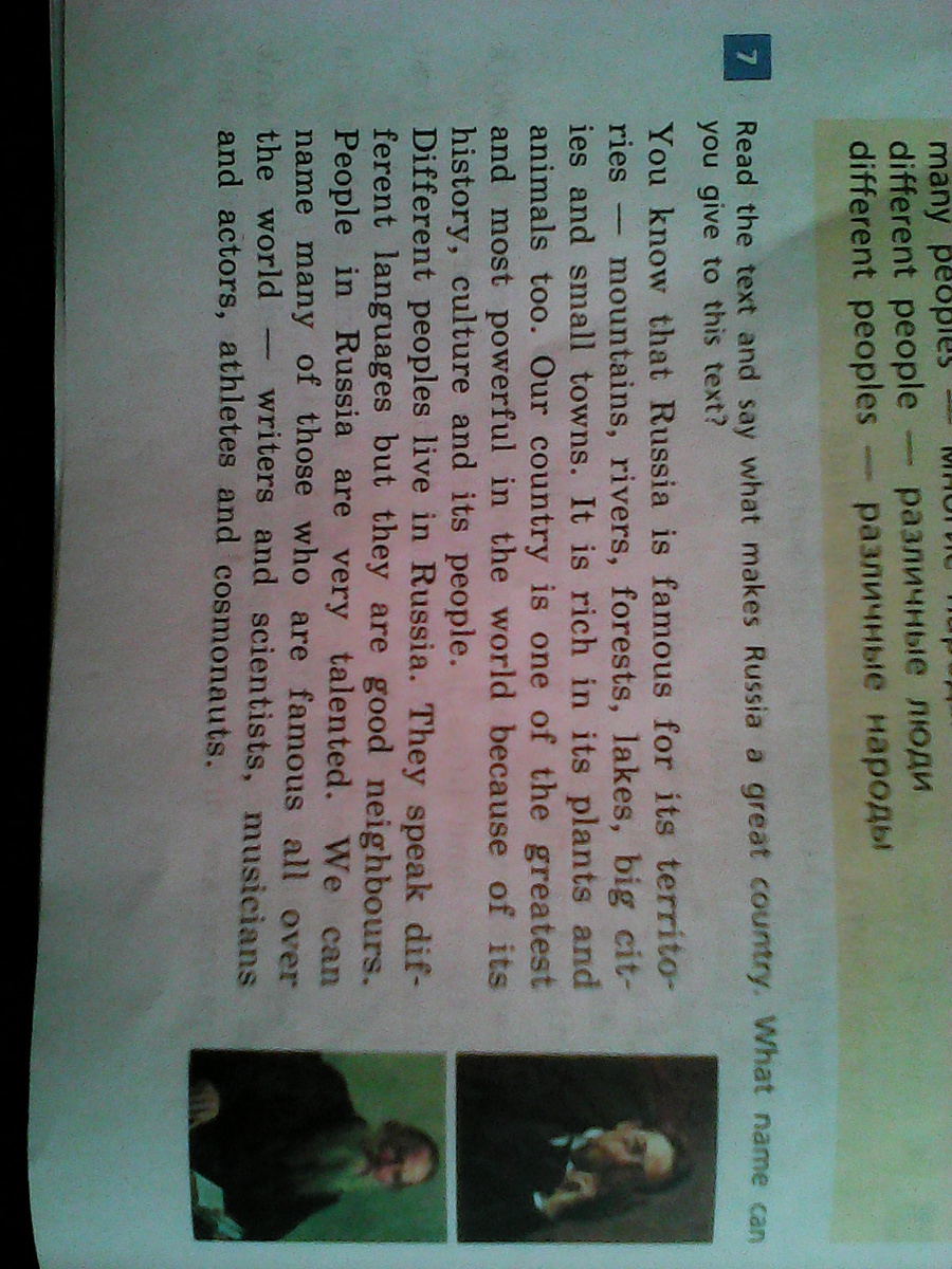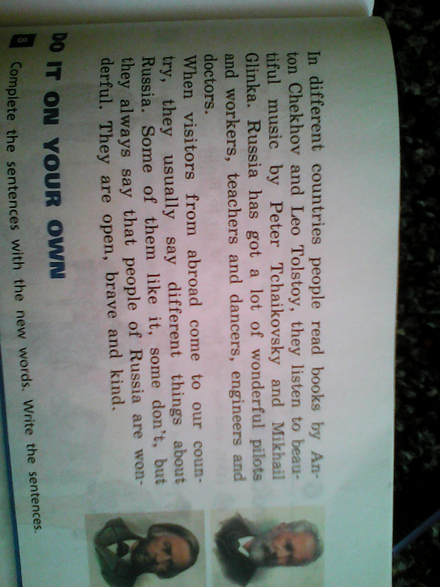 Разные люди живут в России. Они говорят на разных языках, но они хорошие соседи. Люди в России очень талантливые. Мы можем назвать многих из них, кто известен по всему миру - писатели и ученые, музыканты и актеры, спортсмены и космонавты. В разных странах люди читают книги Антона Чехова и Льва Толстого, они слушают красивую музыку Петра Чайковского и Михаила Глинка. Россия получила много пилотов и рабочих, учителей и танцоров, инженеров и докторов.