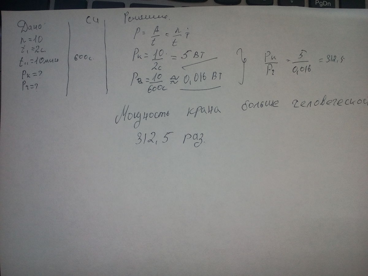 Кран поднимает 10 кирпичей за 2 секунды, а рабочий за 10 минут. Чья мощность больше? (с дано, си и решением)