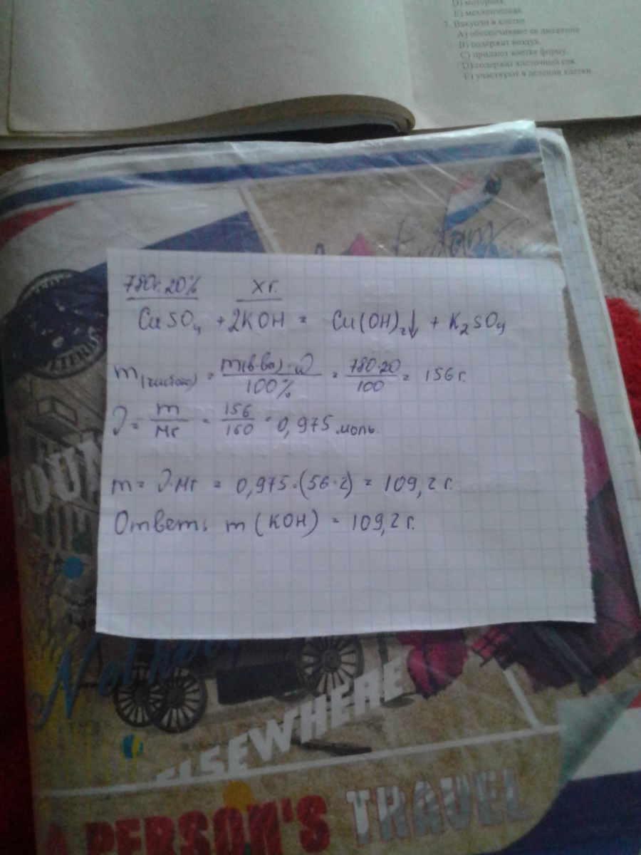 вычислите массу осадка,который выпал при взаимодействии 780 г. 20%раствора сульфата меди(2) с гидроксидом калия.сколько гидроксида калия ушло в реакции?
