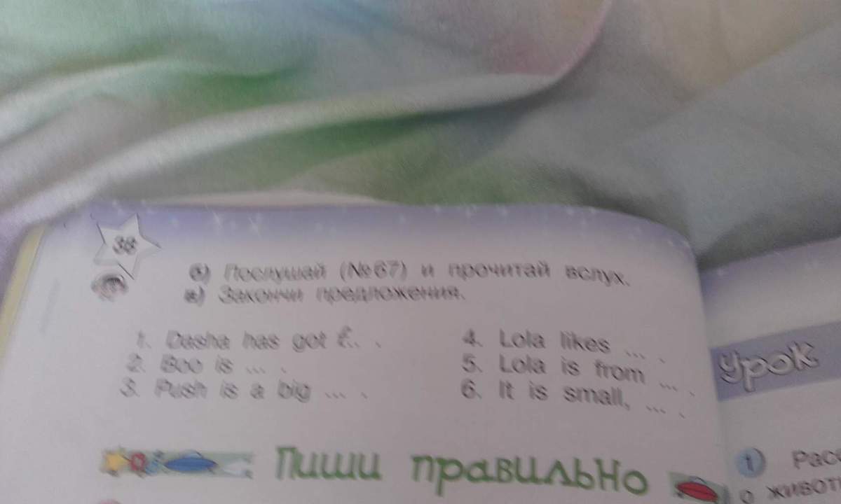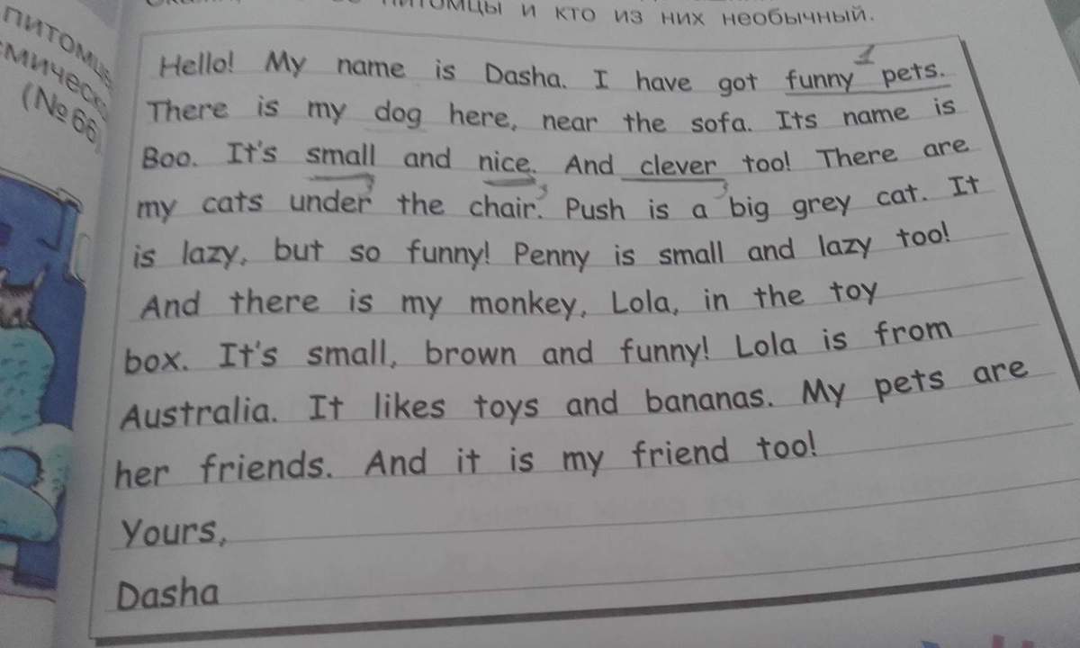 На основании текста, закончи предложение: 1) Dasha has got..... 2) Boo is.... 3) Push is a big.... 4) Lola likes... 5) Lola is from... 6) It is small,