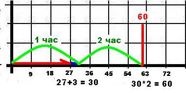 собственная скорость теплохода 27 километров в час а скорость течения реки 3 километров час покажи на схеме какое расстояние пройдет теплоход от точки А за 2 часа двигаясь по течению реки если одно деление равно 9 километров