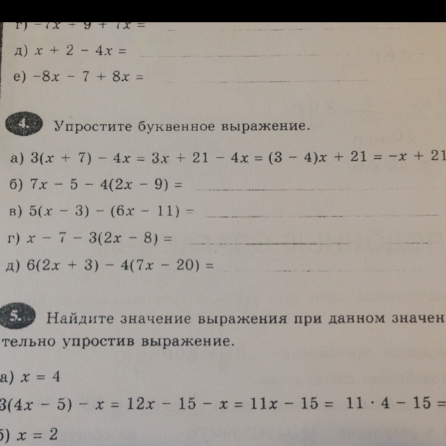 в)5(х-3)-(6х-1)=5х-15-6х+11=-х-4