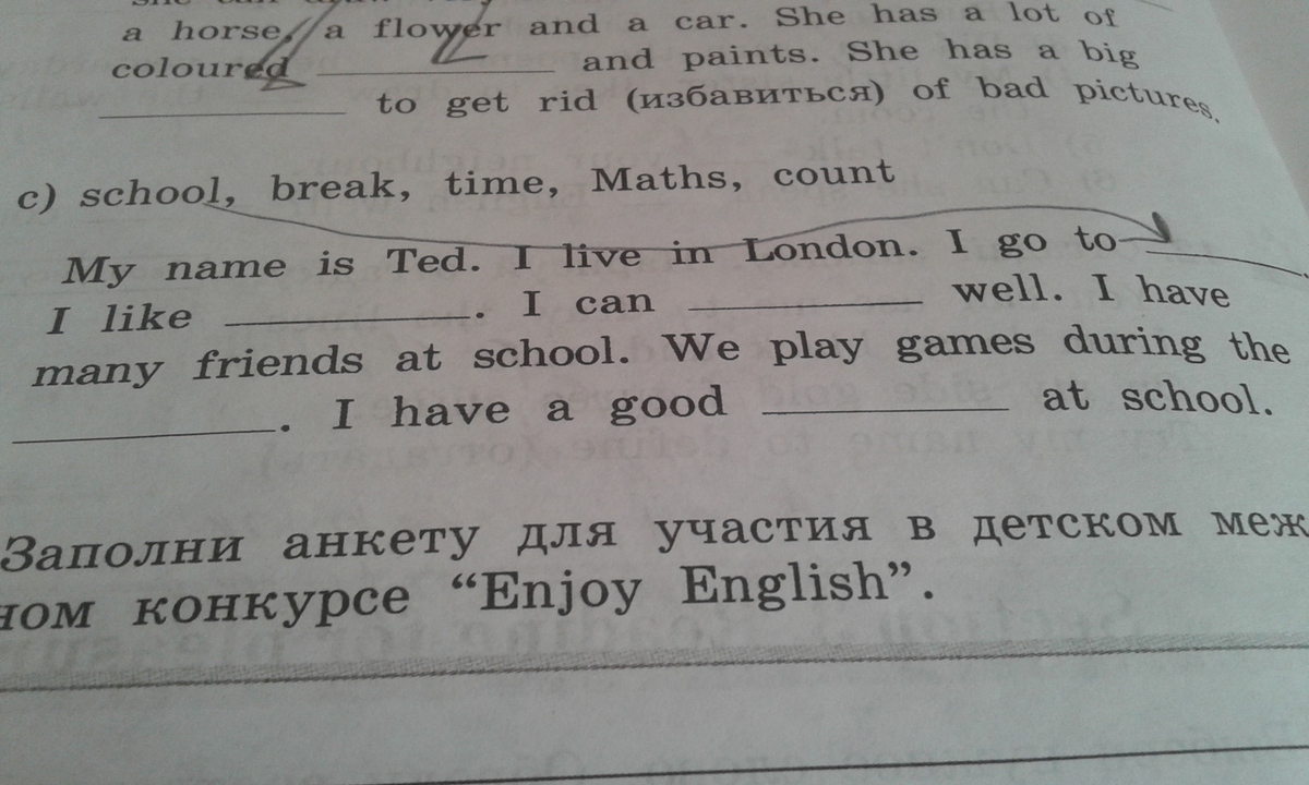 I like Math. I can count well. We play games during the break. I have a good time at school.