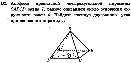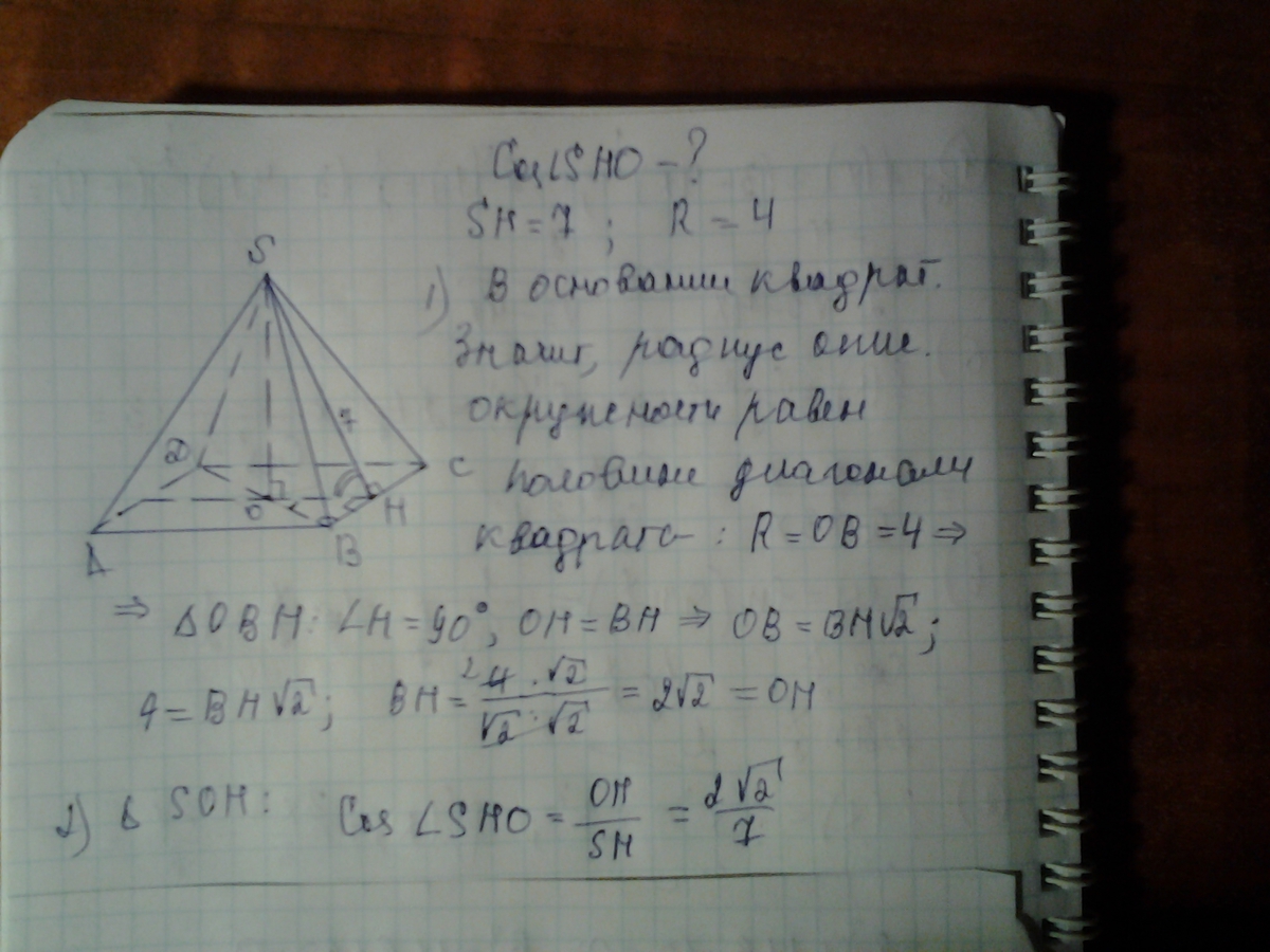 СРОЧНО!!! Апофема правильной четырехугольной пирамиды SABCD равна 7, радиус описанной около основания окружности равен 4 . найдите косинус двугранного угла при основании пирамиды.