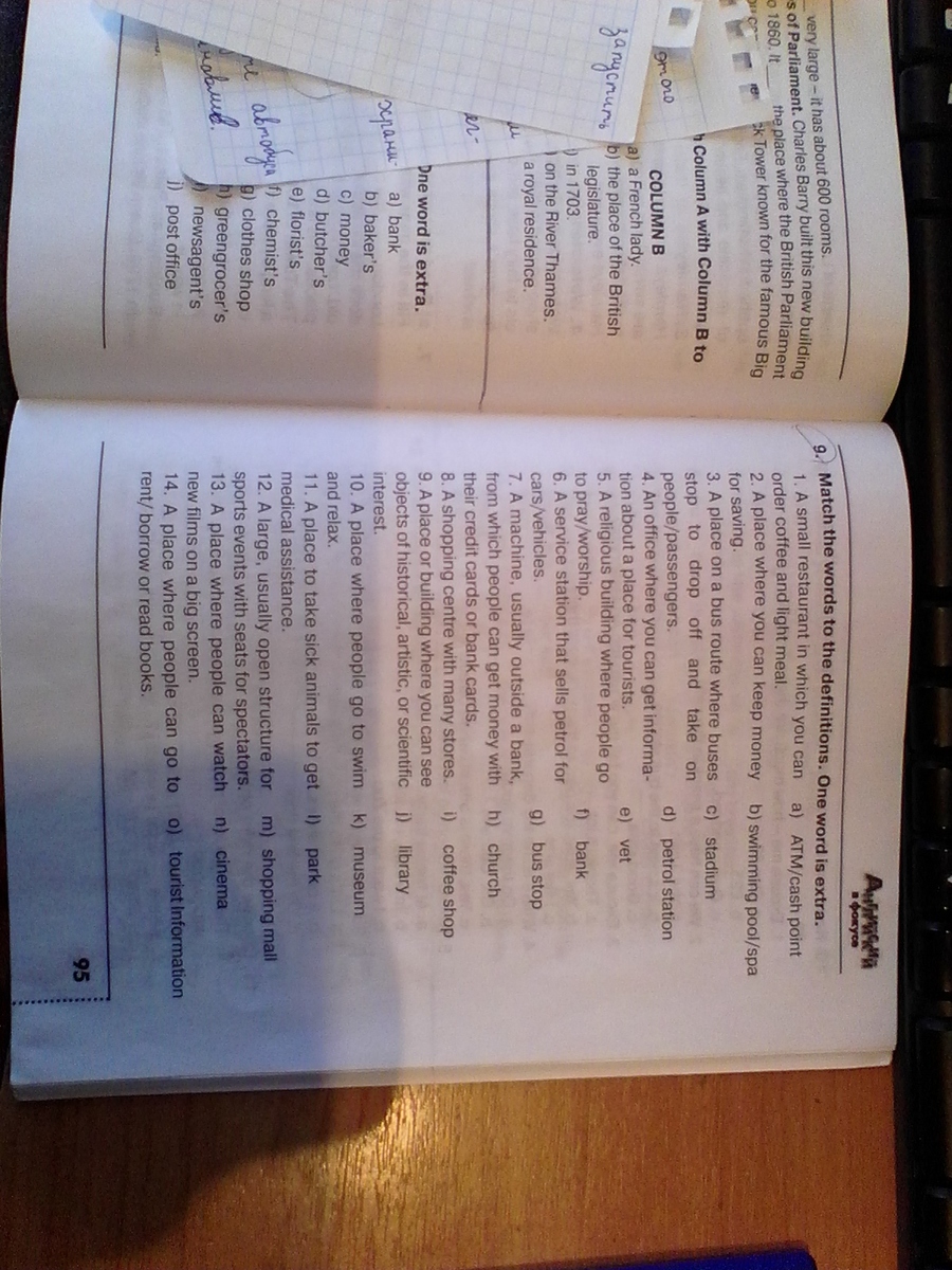9) Match the words to the definitions. One word is extra 1 A small restaurant in which you can a) ATM cash point order coffee and light meal. 2 A place where you can keep money b swimming pool / spa lor saving. 3 A place on a bus route where buses a) etndum stop to drop off and take on people passengers. d) 4 An office where you can get nforma. ton about a place for tourists 5. A religious building where people to pray worship. bank 6 A service station that solo patrol for cars whicles 7 A machine, usually outvide a bank. from which people can get money with h) church ner credit cards or bank cards. 8 A shopping Centre wth many stores. 9 Apace where you can see objects of historical, artistic, or scientific D library 10, A plnce where people go to swim K) museum and relax 11. A take sick animals to get park 12 A large, usually open structure tor m) shopping mall sports events with seats for spectators 13. A place where people can watch n) cinema new films on a big screen 14 A people can go to o tourist information place where rent / borrow or read books,