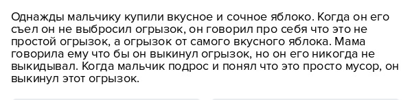 Однажды я взял яблоко .А потом я съел его от него остался только огрызок.Я решил не выкидывать огрызок и оставил его себе.Потом взял ножик и вытащил оттуда косточки.В скором времени я посадил эти косточки в землю у себя в саду.Через год у меня выросла яблоня и на ней появились яблочки я съел одно яблоко и остался огрызок я тоже взял и посадил косточки.Вот и у меня получился целый сад!