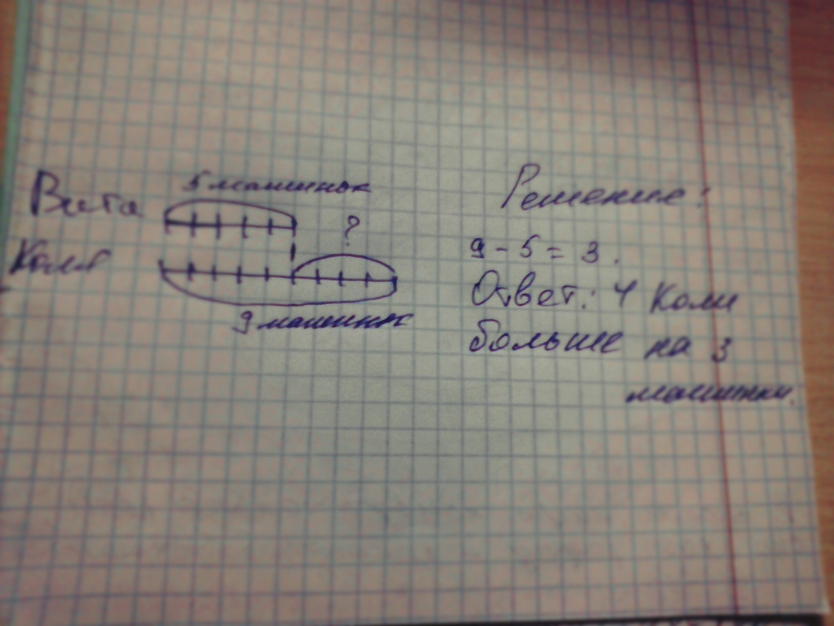 Составь схему к тексту .По схеме составь равенство. У Вити 5 машинок а у Коли 9 машинок. На сколько машинок у Коли больше, чем у Пети?