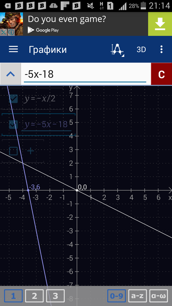 Я тебе в программе нарисовал белым цветом график первой функции (у=-х/2) и синим график второй (у=-5х-18) (просто в школе их надо ещё и подписывать). Поставь 《+》 в комментариях, если получил скриншот программы, если не сложно.