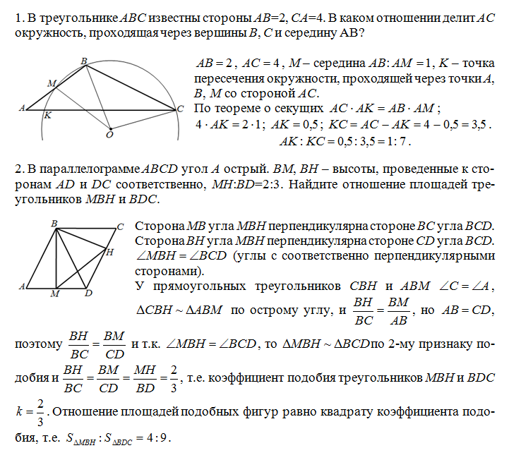 1. В треугольнике ABC известны стороны AB=2, CA=4. В каком отношении делит AC окружность, проходящая через вершины B, C и середину AB?