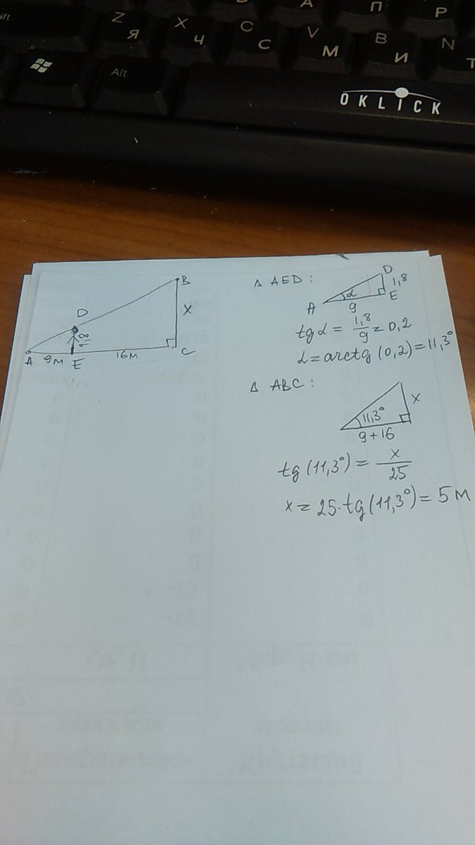 человек , рост которого равен 1,8 м, стоит на расстоянии 16 м от уличного фонаря . при этом длина тени человека равна 9 м . определите высоту фонаря ( в