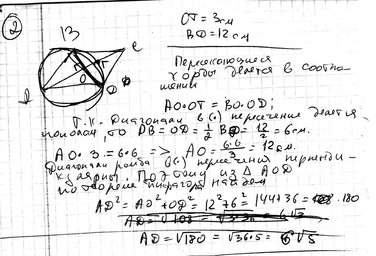 Диагонали параллелограмма АВСD пересекаются в точке О. Вершины А,В,и D лежат на окружности, которая пересекает отрезок ОС в точке Т. Вычислите длину отрезка АО, если известно, что ТО= 3см, ВD=12см.