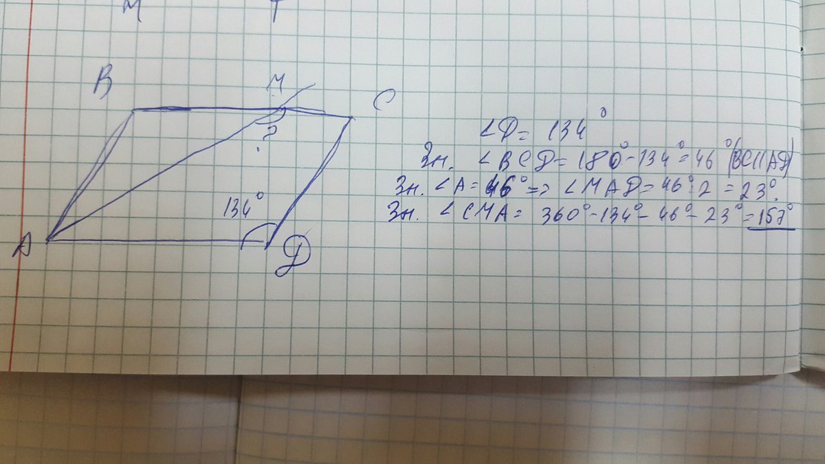 Помогите,плиз! В параллелограмме ABCD биссектриса угла A пересекает сторону BC в точке М. Найдите градусную меру угла CMA,если угол CDA=134 градусам