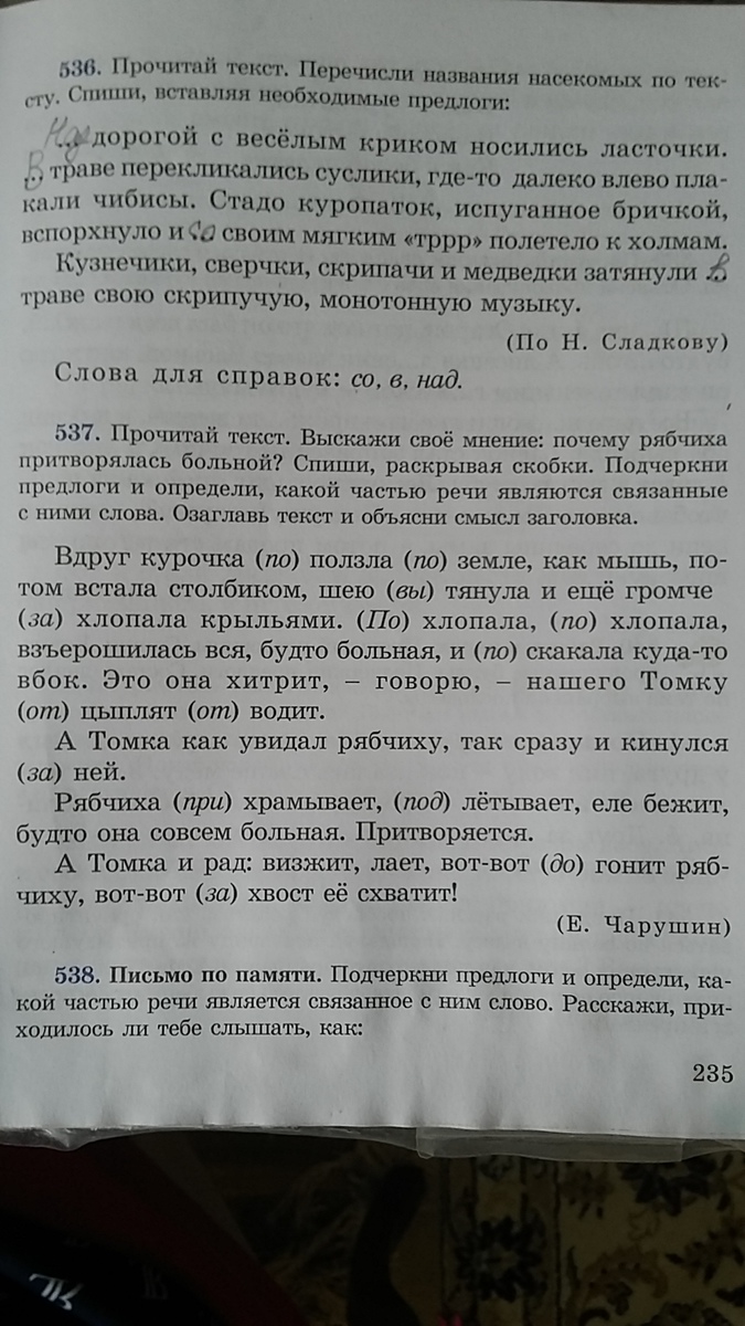 Вдруг курочка поползла по(предлог) земле(сущ),как мышь,потом встала столбиком,шею вытянула и ещё громче захлопала крыльями.Похлопала,похлопала,взъерошилась вся,будто больная, и поскакала куда-то вбок. Это она хитрит,-говорю,- нашего Томку от(предлог) цыплят (сущ) отводит.