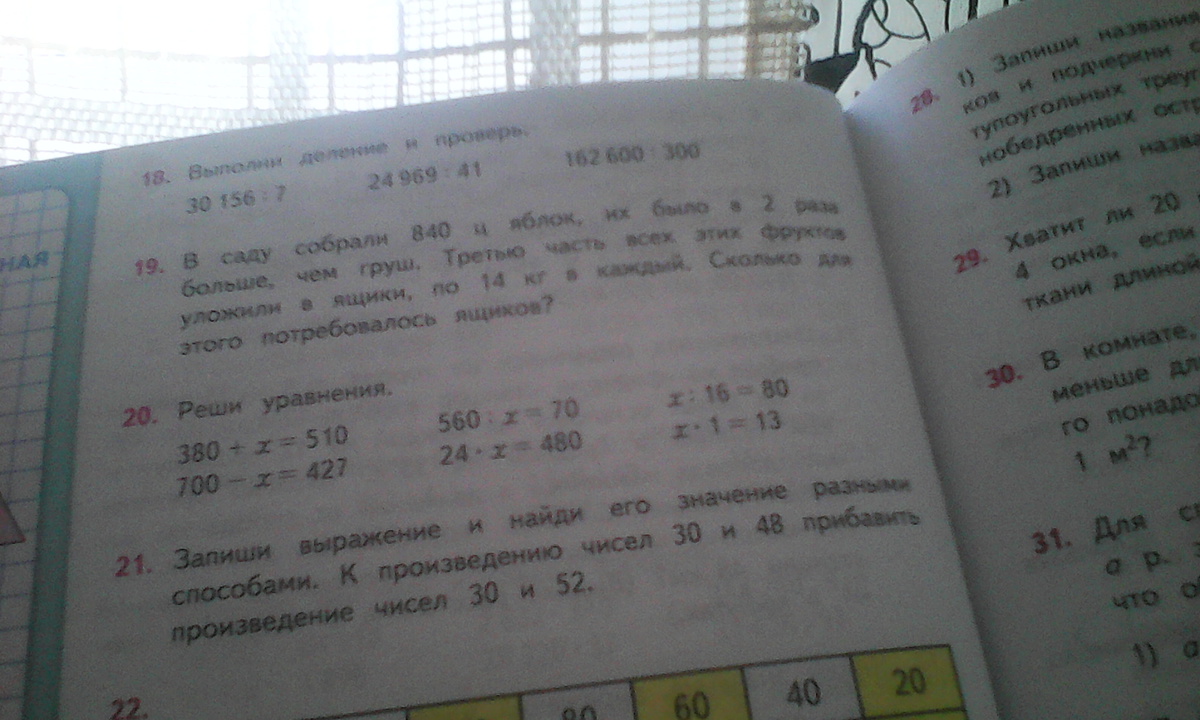 840÷2=420(груш) 840+420=1260 (вместе груш и яблок) 1260÷3=420 (треть) 420÷14=30 ( ящиков)