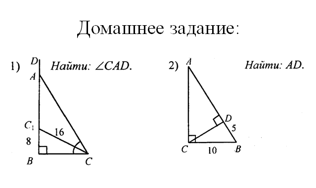 2) решение: СВ^2=AB*BD, AB=100/5=20, AD=20-5=15.( катет является средним геометрическим между гипотенузой и проекцией его на гипотенузу: катет СВ в квадрате=произведению гипотенузы АВ на ВД; 10^2=AB*5; 100=АВ*5