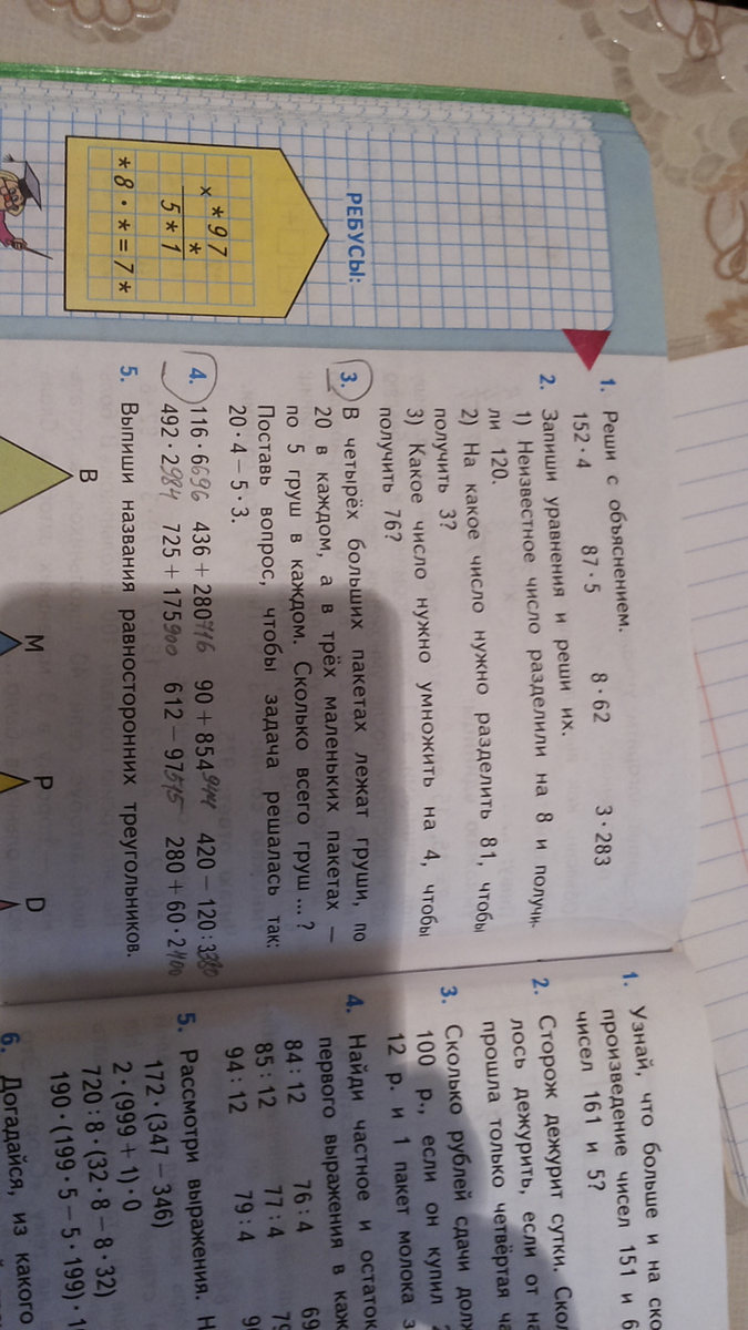На сколько груш больше лежит в 4 пакетах, чем в 3 маленьких пакетах?