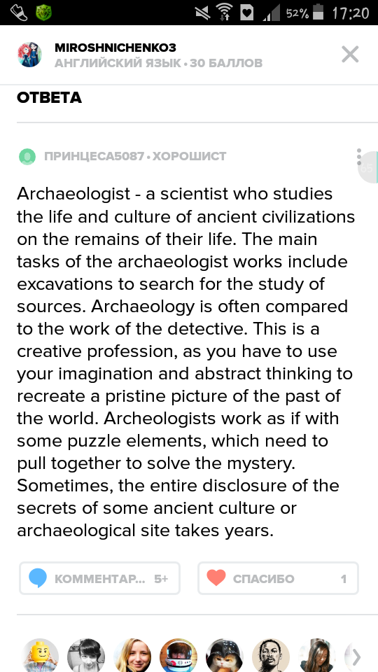 Археолог- это ученый, который изучает жизнь и культуру древних цивилизаций по остаткам их жизней. Главные задания в работе археолога включают раскопки для поиска изучаемых источников. Археологию часто сравнивают с работой детектива.Это креативная профессия, потому что вы используйте ваше воображение и абстрактное мышление для воссоздания первозданной картины прошлого мира. Археологи работают с некоторыми элементами головоломки, которую нужно сложить вместе, чтобы разгадать тайну. Иногда, полное раскрытие секретов какой-то древней культуры или археологических местонахождений занимает годы.
