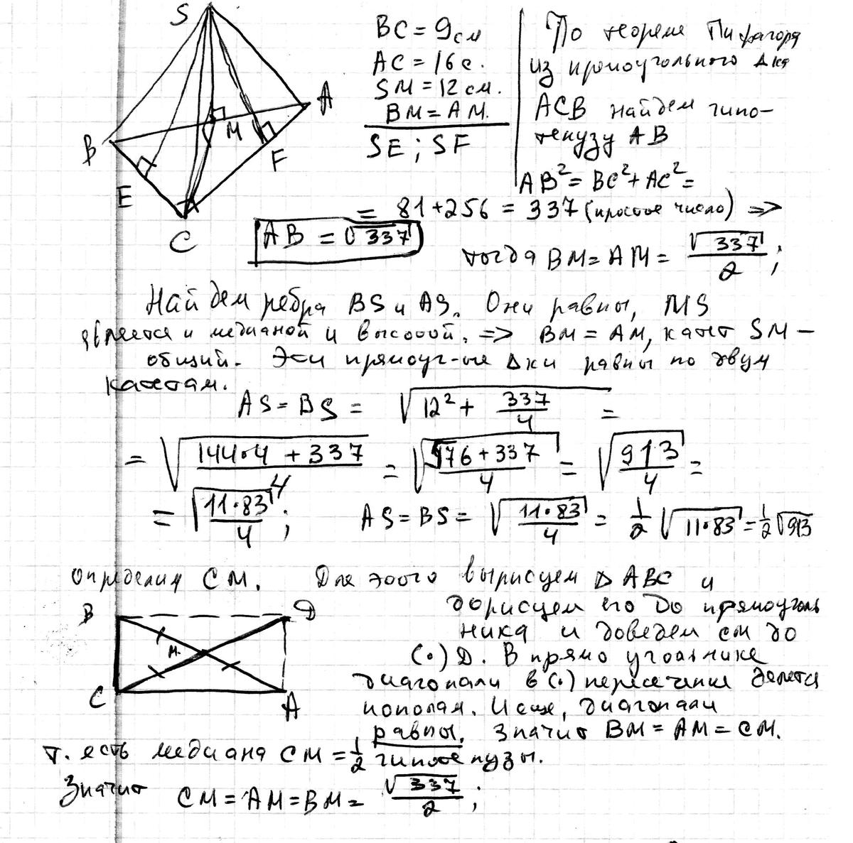 Длины катетов прямоугольного треугольника равны 9 см и 16 см. К плоскости треугольника из середины гипотенузы восстановлен перпендикуляр, длина которого равна 12 см. Вычислите расстояния от свободного конца перпендикуляр до катетов