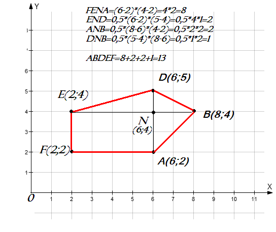 помогите пожалуйста начертите координатный угол с единичными отрезками на осях 1 см. Построейте точки по их коодинатам: А(6,2) В(8,4) D(6,5) E(2,4) F(2,2) Соедините точки:А с В, В с С, С с D, D с Е, Е с F, F с А. Найдите площадь образовавщейся фигуры