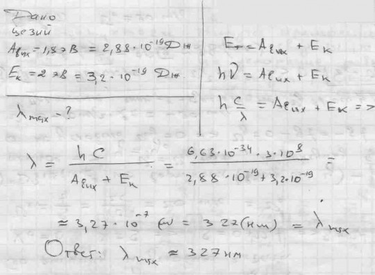 Фотоэлектроны, выбитые из цезия, имеют кинетическую энергию 2эВ. Какова длина волны, вызывающая фотоэффект?Работа выхода из цезия 1,8 эВ. Помогите, не могу понять.