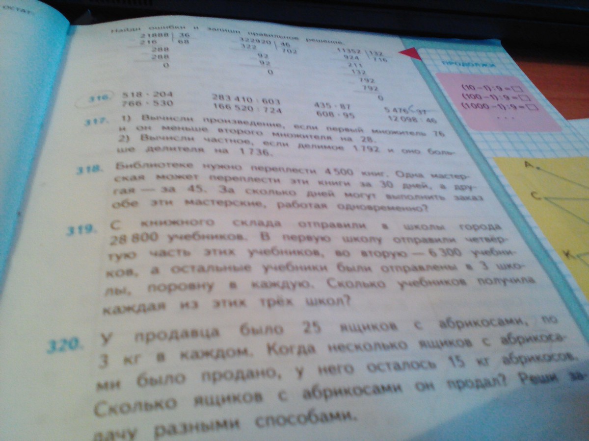 1)28800/4=7400 книг отправили в перпвую школу 2)7400+6300=13700 книг сумма книг отправленных в первую и во вторую школу 3)28800-13700=15 300 книг это сумма книг отправленных в 3 школы 4)15300/3=1500 книг в каждую школу из 3 школ