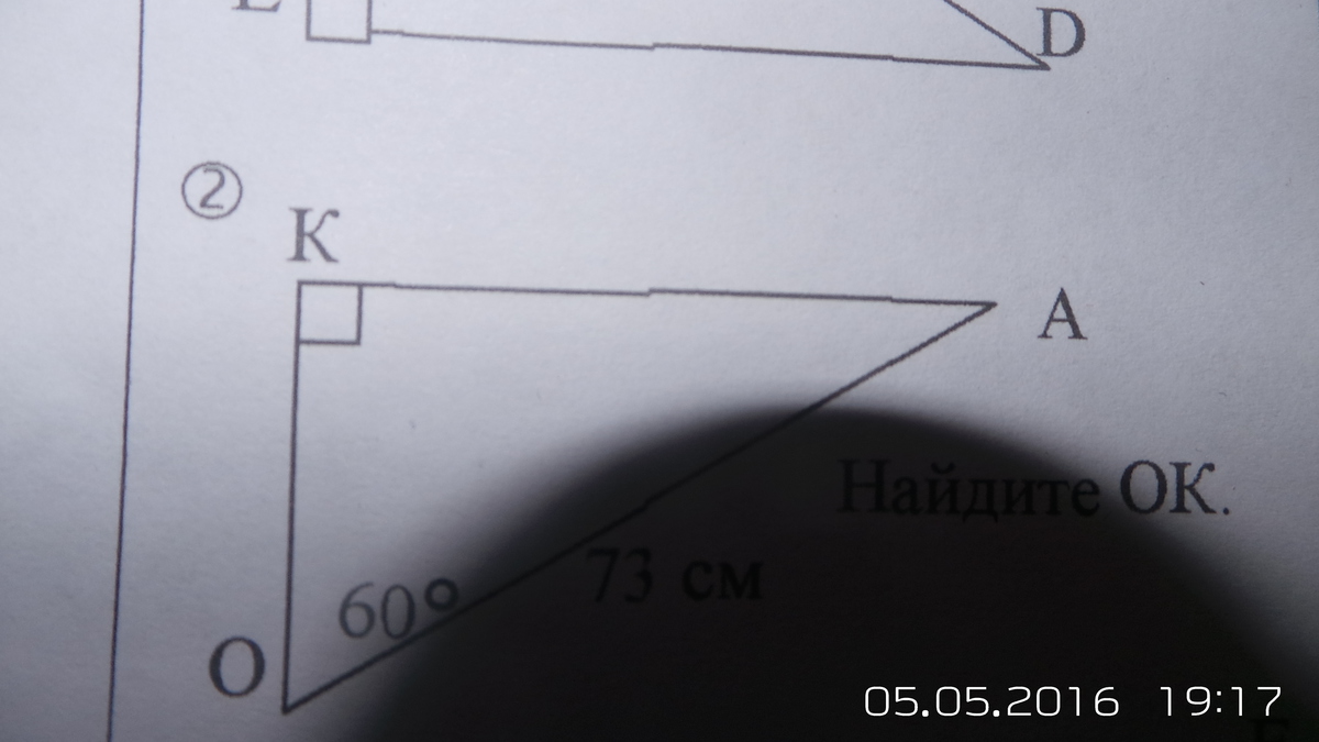 Следовательно ОК 73/2= 36,5 т.к катет лежащий против угла в 30 градусов равен половине гипотинузы ( гипотенуза АО)