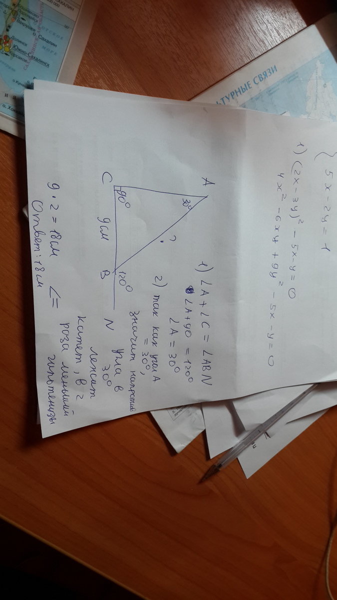 там кут АВС, виходить дорівнює 60 градусів , звідси кут САВ 30 градусів сторона ,що лежить на впроти кута 30 градусів дорівнює половині гіпотенузі, отже гіпотенуза 18см.