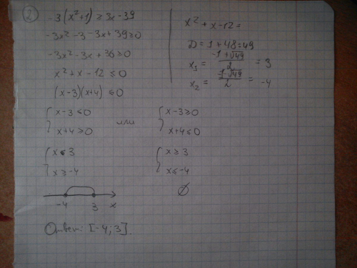 2)-3(х^2+1)≥3х-39 -3x^2-3-3x+39≥0 -3(x+3)(x-4)≥0 x≥-3 и х≥4