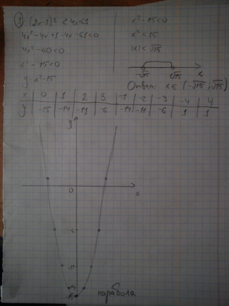 1) (2х-1)^2<4x+61 4x^2-4x+1-4x-61<0 4(x-5)(x+3)<0 x<5 и x<-3