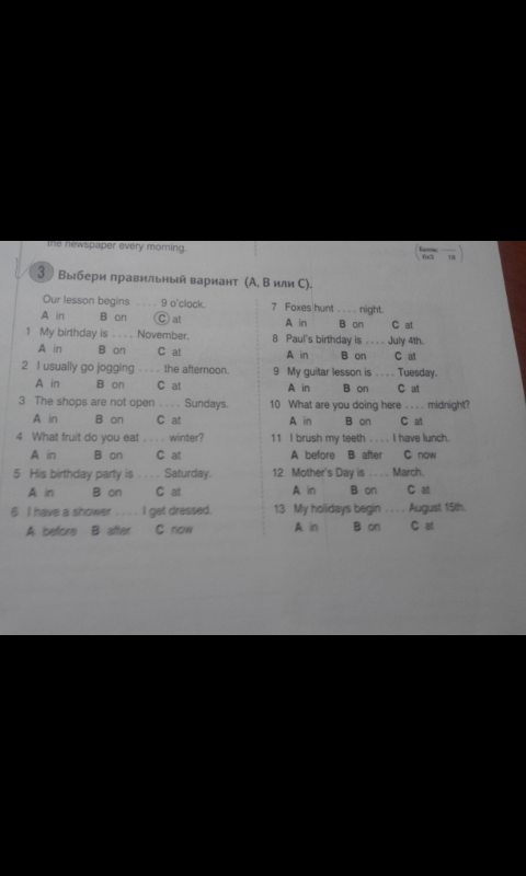 1 in 2 on 3 on 4 in 5 in 6 before 7 on 8 in 9 on 10 at 11 after 12 in 13 in