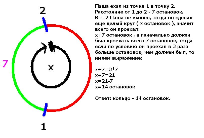 Паше нужно проехать на трамвае по кольцу 7 остановок, но он на минутку задумался и пропустил свою остановку. После этого он решил не ехать обратно, а доехать до нужной ему остановки по кольцу. На этот раз он вышел вовремя, но оказалось, что он проехал в 3 раза больше остановок, чем должен был. Из какого количества остановок состоит кольцо?