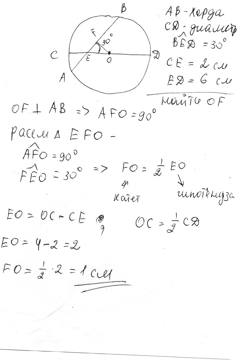 Хорда пересекает диаметр под углом в 30o и делит его на два отрезка, равные 2 и 6. Найдите расстояние от центра окружности до этой хорды