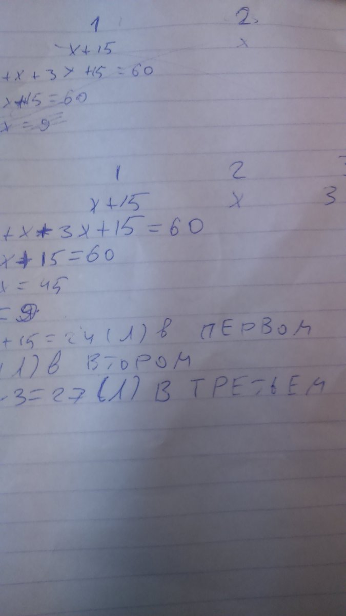 В трёх цилиндрах 60 тонн бензина, в первом цилиндре на 15 тонн больше чем во втором,а в третьем в три раза больше,чем во втором ,Сколько тонн бензина во втором цилиндре?