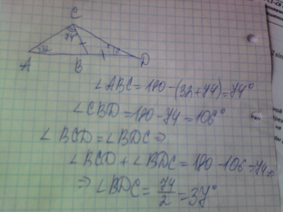 В треугольнике ABC угол A равен 32 градуса, угол C равен 74 градуса. На продолжении стороны AB отложен отрезок BD=BC. Найдите угол D треугольника BCD/ Ответ дайте в градусах.