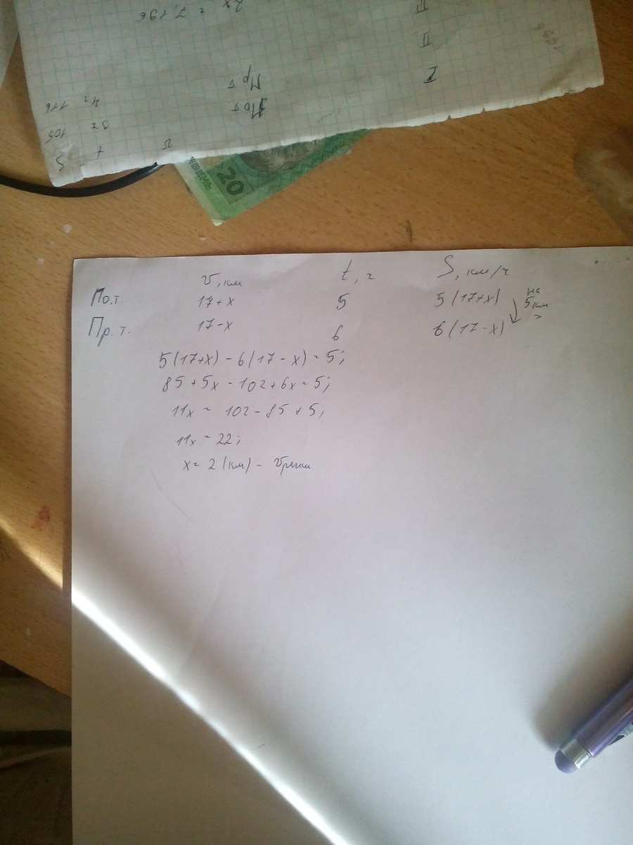 Помогите пожалуйста!! За 5 ч по течению реки моторная лодка проплывает на 5 км больше, чем за 6 ч против течения. Найдите скорость течения реки, если собственная скорость лодки 17 км/ч.