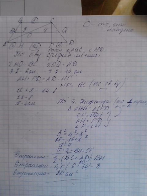 боковая сторона равнобедренной трапеции равна 5, диагональ делит ее среднюю линию на отрезки длинами 3 и 7 см. найдите площадь трапеции