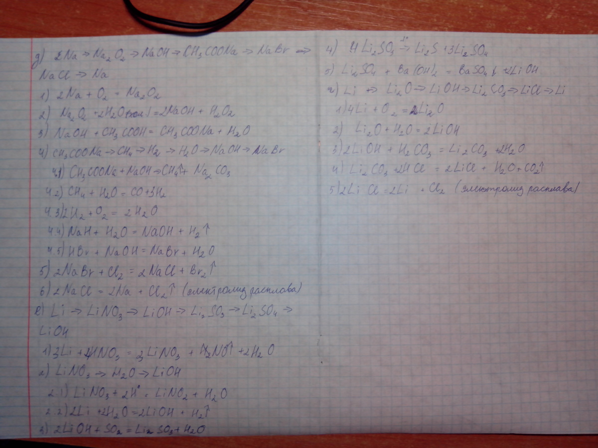 Прошу помочь, Напишите уравнения реакции , с помощью которых можно осуществить следущие превращения: в) Натрий --сульфид натрия--гидроксид натрия--хлорад натрия--хлорид натрия--нитрад натрия--нитрит натрия г) литий --оксид лития--гидроксид лития--карбонат лития --хлорид лития--литий д) Натрий--пероксид натрия--гидроксид натрия--ацетат натрия --бромид натрия --хлорид натрия -натрий ж) натрий --гидрид натрия-- гидроксид натрия--формиат натрия--хлорид натрия--гидросульфат натрия--сульфат натрия-- иодид натрия--гидроксид натрия е) литий--нитрид лития--гидроксид лития--сульфит лития--сульфат лития--гидроксид лития.