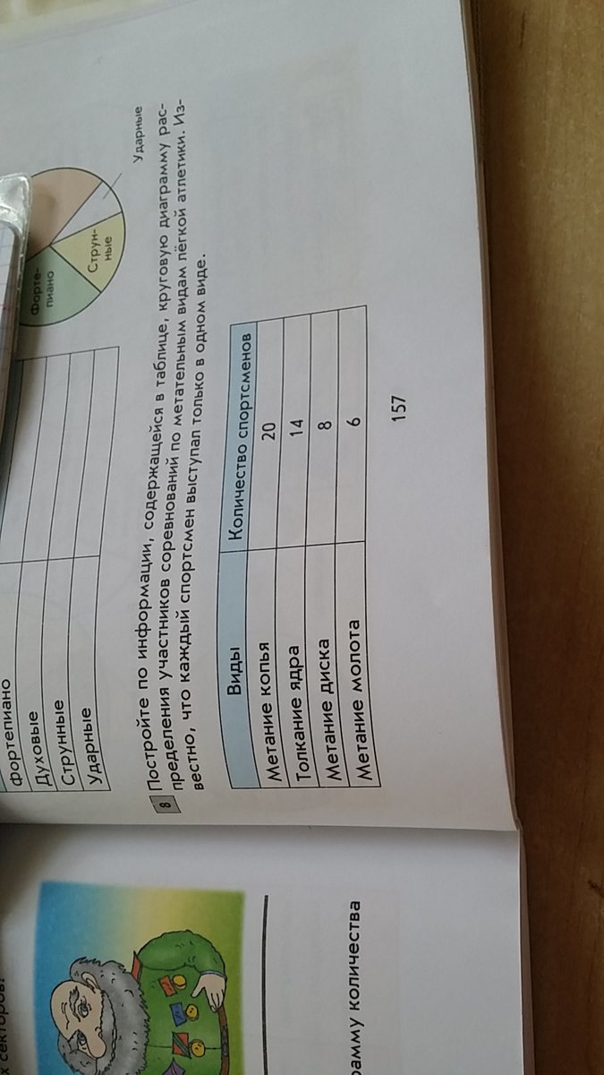 прошу помогите решите задачу по действиям. постройте по информации содержащейся в таблице круговую диаграмму распределения участников соревнований по метателтным видам лёгкой атлетики. известно что каждый спортсмен выступал толтко в одном виде