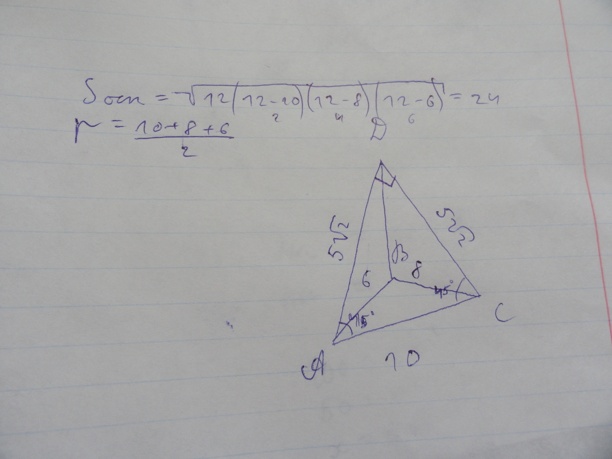 Помогите пожалуйста)В основании пирамиды лежит треугольник со сторонами 10, 8 и 6. Боковые ребра наклонены к плоскости основания под углом 45°.Найдите площадь полной поверхности. Пожалуйста с рисунком